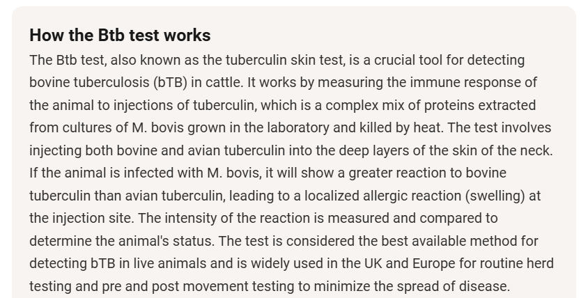 The response says that “a complex mix of proteins extracted from cultures of M. bovis grown in the laboratory” are injected into the “deep layers of the skin”. This is not a representation of what happens in nature. This is not a natural mode of entry. Then also consider that the tuberculin is a concoction of cultured proteins in a glycerine liquid unnaturally injected into an animal. Is it any wonder that lumps appear on some cattle! There are no controls to see whether it is just the glycerine liquid alone that causes the swelling in cattle! There are no controls to test whether it is just the needle alone that causes the swelling! If Btb allegedly effects the cows lungs then why not simply test the breath of the cow or it’s sputum for the bacterium? They do not perform these logical tests because there is no empirical evidence that bacteria causes sickness. It is pure belief that allows this fraud to persist.